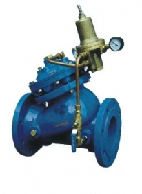 当管道从进水端给水时,水流过针阀进入主阀控制室,出口压力通过导管作用到导阀上,当出口压力高于导阀设定值时,导阀关闭,控制室停止排水,此时主阀控制室内压力升高并关闭主阀,出口压力不再升高。 当出口压力降到导阀设定压力时导阀开启,控制室向下游排水。由于导阀的排水量大于针阀的进水量,主阀控制室压力下降,进口压力使主阀开启。稳定状态下,控制室进水、排水相同,开度不变,出口压力不变。调节导阀弹簧即可设定出口压力。