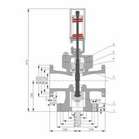2、主安全阀结构如图所示,双排汽,两端为法兰连接结构,主要由阀体、阀盖、缓冲阀、活塞室、阀瓣、阀杆等零件组成。缓冲阀装设一只止回阀,可改变缓冲时间,在主安全阀动作过程中起缓冲作用,避免密封面或阀瓣损坏。