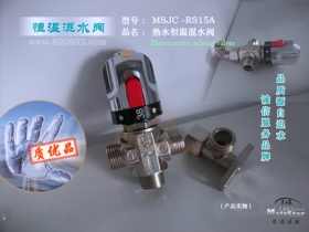 MSJC&曼德达尔品牌恒温混合阀TMV(Thermostatic Mixing Valves)是专为热水温控系统研制的配套高端热水工程专用恒温产品,集成有更高端的温显数字恒温控制手柄和恒压恒温内部调节件。RS15A热水恒温混合阀无需外接电源,结构紧凑,温度调节自由恒温设定,能够精准的达到节水节能、舒适恒温的效果;这款恒温系列目前广泛应用于太阳能热水器、燃气热水器、电热水器、空气能热泵、地源热泵、锅炉等集中供热水恒温系统工程等水压经常变化的复杂环境(如家庭别墅、宾馆酒店、医院、学校、部队野战洗浴车、豪华游艇、游泳场馆及桑拿洗浴中心等中小型生活热水、公共洗浴用水恒温系统)。