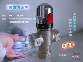 MSJC&曼德达尔品牌恒温混合阀TMV(Thermostatic Mixing Valves)是专为热水温控系统研制的配套高端恒温产品,集成有更高端的温显数字恒温控制手柄和恒压恒温内部调节件。RS20A热水恒温混合阀无需外接电源,结构紧凑,温度调节自由恒温设定,能够精准的达到节水节能、舒适恒温的效果;这款恒温系列目前广泛应用于太阳能热水器、燃气热水器、电热水器、空气能热泵、锅炉等集中供热水恒温系统工程等水压经常变化的复杂环境。(目前主要用于热水器配套或独立出口外贸采购)