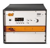 The Model 500T7z5G18 is a self contained, forced air cooled, broadband traveling wave tube (TWT) microwave amplifier designed for applications where instantaneous bandwidth, reduced harmonics and high gain are required. A reliable TWT subsystem provides a conservative 500 watts minimum at the amplifier output connector. Stated power specifications are at fundamental frequency. The amplifier‘‘s front panel digital display shows forward and reflected output plus extensive system status information accessed through a series of menus via soft keys. Status indicators include power on, warm-up, standby, operate, faults, excess reflected power warning and remote. Standard features include a built-in IEEE-488 (GPIB) interface, 0 dBm input, VSWR protection, gain control, RF output sample port, plus monitoring of TWT helix current, cathode voltage, collector voltage, heater current, heater voltage, baseplate temperature and cabinet temperature. Modular design of the power supply and RF components allow for easy access and repair. Use of a switching mode power supply results in significant weight reduction. The rated power is developed by efficiently power combining the outputs from two 300 watts (nominal) microwave tubes that are factory matched in gain and phase to offer moderate harmonic levels without added filters. Housed in a stylish contemporary cabinet, this unit is designed for benchtop use, but can be removed from cabinet for rack mounting. The Model 500T7z5G18 provides readily available RF power for a variety of applications in Test and Measurement, (including EMC RF susceptibility testing), Industrial and University Research and Development, and Service applications. See Model Configuration for package alternatives, alternate primary power, and special features.