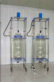 在双层玻璃反应釜内层放入反应介质,通过向双层玻璃反应釜夹套内注入恒温的(高温热水、导热油或低温冷冻液)对反应釜内的物料进行恒温加热或制冷,并且可以提供机械搅拌。使密封的玻璃反应釜内在设定的恒温条件下,进行真空搅拌反应,蒸馏浓缩反应,分离萃取反应,合成结晶反应、反应发热等实验。实验完毕,物料可从釜底的聚四氟乙烯放料口放出,操作极为方便。