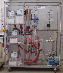 蒸发器整体全部为硼硅玻璃3.3材质,使用导热油加热,整个蒸发过程(包括物料的进入、膜的分布、馏分液体的形成、搅拌装置的转动等)都可以直观目视。蒸发器的内置冷凝器形状为螺旋盘管,冷凝面积大于蒸发面积,保证馏分能被充分冷凝。真空接口位于蒸发器下部,馏分气体物料的流动方向与真空抽气方向相同,避免馏分的二次污染,有助于提高分离效果。