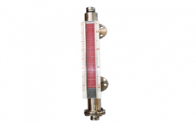 它有一容纳浮球的腔体我们称其为主体管或外壳,它通过法兰或其他接口与容器组成一个连通器;这样它腔体内的液面与容器内的液面是相同高度的,所以腔体内的浮球会随着容器内液面的升降而升降;这时候我们并不能看到液位,所以我们在腔体的外面装了一个翻柱显示器,因为我们在制造浮球时在浮球沉入液体与浮出部分的交界处安装了磁钢,它与浮球随液面升降时,它的磁性透过外壳传递给翻柱显示器,推动磁翻柱翻转180°;由于磁翻柱是有红、白两个半圆柱合成的圆柱体,所以翻转180°后朝向翻柱显示器外的会改变颜色(液面以下红色、以上白色),两色交界处即是液面的高度。