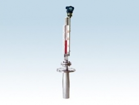 该产品由本体(由上、下导管组成)、翻板箱(由红、白双色磁性小翻板组成)、浮子(由磁体、顶杆、浮筒 组成)、以及液位变送器等组成,其结构如图所示。工作原理为:容器内的浮筒(按不同介质和压力针对研制), 在下导管中随液面高度的变化而上下浮动并通过顶杆使磁体在上导管内上下移动,促使本体外的翻板翻动 并显示红、白颜色来指示液面高度,同时液位变送器将液位信号传送至控制中心进行液位指示和控制,也 可通过计算机进行集中监控。